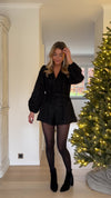 The Black Caroline Jumpsuit combines playful texture with a flattering silhouette. Made from fringe-effect fabric, it features a V-neck, slightly ballooned sleeves, and a side tie belt to accentuate the waist. Fully lined for comfort and ease of wear.