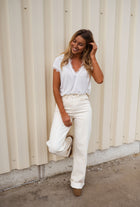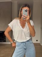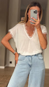 • The White Soho T-Shirt brings a perfect blend of casual and chic. With short sleeves, a delicate lace finish, and a flattering V-neck, it’s the ideal piece for a stylish yet comfortable look.