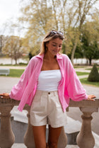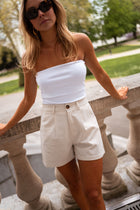 • High-rise beige mini shorts that offer pockets on the front, a button and zipper duo, and are not form-fitting; comfortable and flattering!