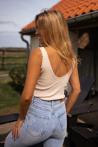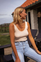 • Stunning beige top with thin straps, dainty scalloped embroidered detailing and a soft, snug feel. The square neckline adds a touch of sophistication to this comfortably form-fitting piece, making it an ideal addition to your wardrobe!