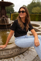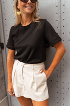 - Elevate your wardrobe essentials this summer with our adorable black T-shirt that features elegantly embroidered sleeves and shoulders. Perfect for any occasion, this easy black tee is staple piece that makes a statement.