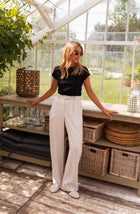 - Our models also wear the Striped Linen Joey Pants and the Light Blue Maddie Jeans.