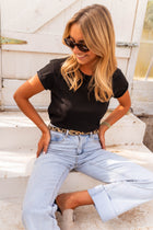 - Classic and simple black t-shirt that features short sleeves with turned edges/hems an a round neckline. This tee is a wardrobe staple that you can style up or down due to its versatility all year round.