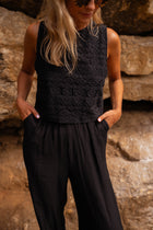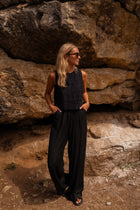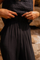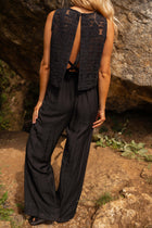 - Indulge in the intricate embroidery on the bust, the feminine open back, and the chic crossed drawstrings at the back! With flowy pants and convenient side pockets, this jumpsuit is both stylish and practical. And with the elastic waistband, you'll have a comfortable fit all day.