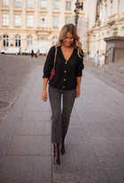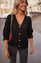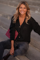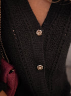 • Black long sleeve cardigan that has beautiful knit detailing, paired with dreamy golden flower shaped buttons. This cardigan has a v-neckline and is super soft and cozy, as well as it being chic!
