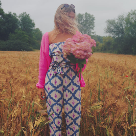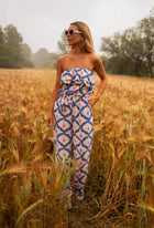 - This sensational blue and pink patterned jumpsuit features an elastic chest paired with ruffle detailing, long pants, a belt to tie in the fabric, and convenient side pockets - making it the perfect combination of comfort and style! Plus, the strapless design adds an alluring touch while the lack of lining ensures a breezy feel.
