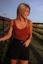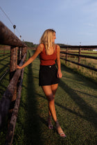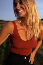 - Embrace a blend of comfort and style with our brick-colored top. Crafted with thin, delicate straps, this piece offers a soft touch against your skin. Its form-fitting design adds a touch of allure to your look, making it a versatile addition to your collection.
