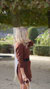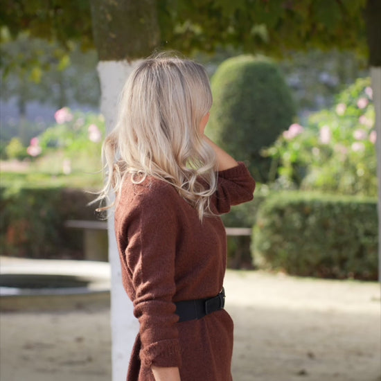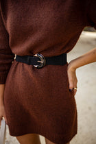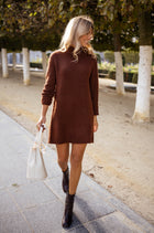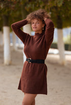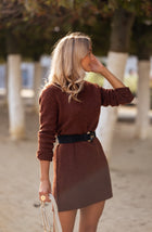 - Beautiful brown, long sleeve dress made in this beautiful soft knit material. This dress has a row of detachable button detailing on the left shoulder, as well as a straight-cut structure. The perfect dress to wear on its own or even paired with tights and a belt to complete the whole look.