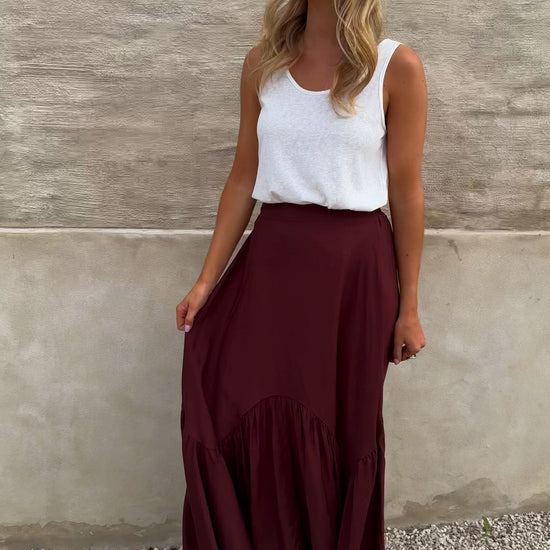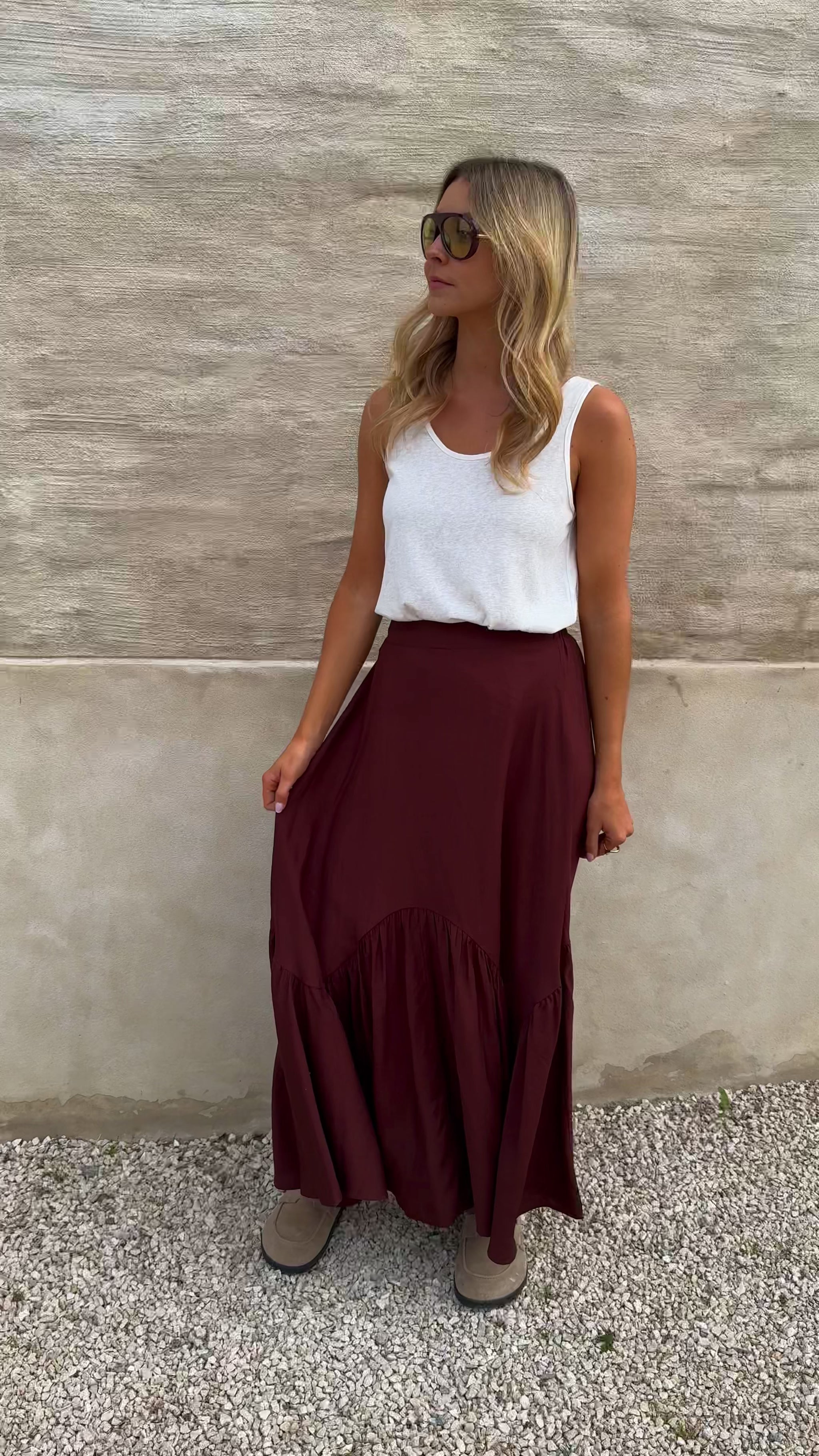 - Effortlessly refined, the Brown Manhattan Skirt is your go-to for easy sophistication. With its fluid drape, soft lining, and elastic waistband, this long skirt offers comfort without compromising style. Perfect for dressing up or down, it brings movement and warmth to any outfit.