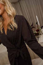 Step into the spotlight with the Brown Sparkle Suzy Dress. Covered in tiny rhinestones, it features a flattering wrap-style neckline, a side tie, and elastic at the waist for a comfortable, feminine fit. Fully lined, this dress blends sparkle and ease for any special occasion.