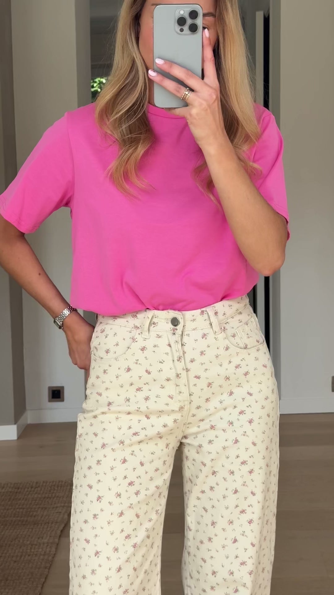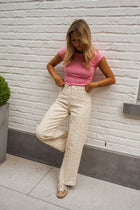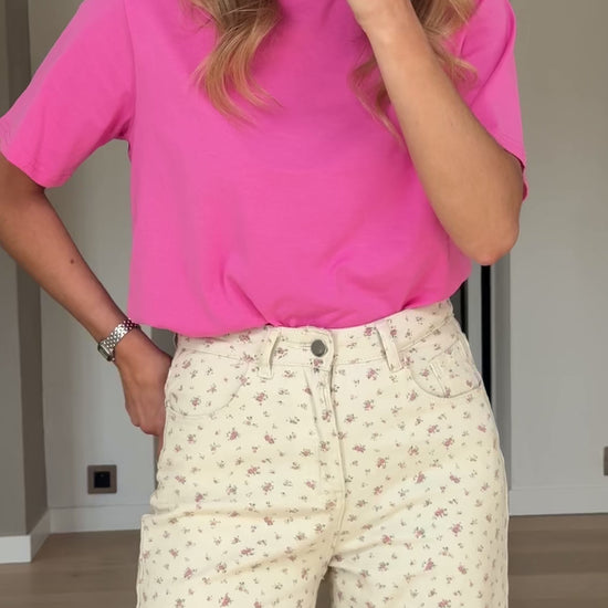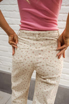 Elevate your denim collection with the Ecru Floral Elia Jeans. Designed with a slightly high waist and straight cut, these jeans feature delicate pink floral motifs over an ecru background for a soft, feminine look. Complete with functional pockets and belt loops, they're the perfect blend of comfort and charm.
