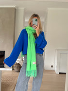 - Crafted from premium cashmere fabric, the Green Ronal Scarf offers both warmth and style. Its soft texture and delicate fringes create a refined look, making it a versatile accessory for any season. Perfect for adding a pop of color and elegance to your outfit.