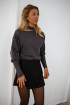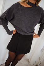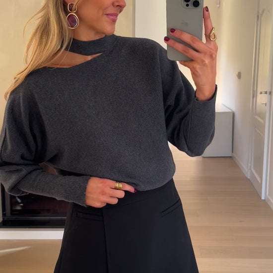 Effortless and modern, the Grey Aiko Sweater features an open collar with a hint of bare-shoulder detail. Its long sleeves and slightly fitted silhouette create a flattering, wearable look, making it perfect for casual outings or layered for a chic, contemporary style.
