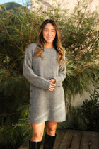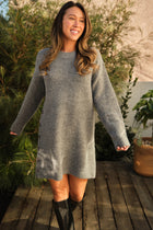 - The Grey Gusto Dress combines simplicity with a stylish twist. Featuring a classic crewneck and long sleeves, this versatile dress is enhanced with side button details that add a unique touch. Perfect for easy styling, this dress offers both comfort and effortless elegance for any occasion