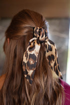 - Add some fierce style to your hair with our Leopard Jersy Hairclip! This chic hair accessory features a trendy leopard print scarf tied around a sleek black hairclip. Elevate any outfit with this must-have piece.