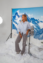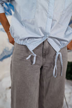 - Showcase your unique style with the Light Blue Hanae Shirt. This trendy top features long sleeves, a buttoning tab, and a lace tie at the bottom for a fashionable twist. Its slightly cropped cut adds a contemporary edge, while the two front pockets offer both practicality and style. Whether dressing up or down, this shirt is your new go-to for effortless chic.