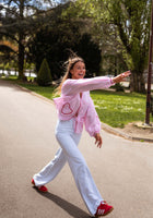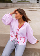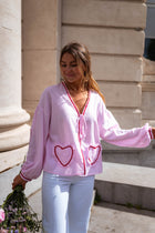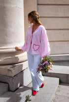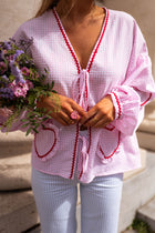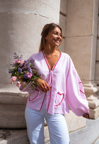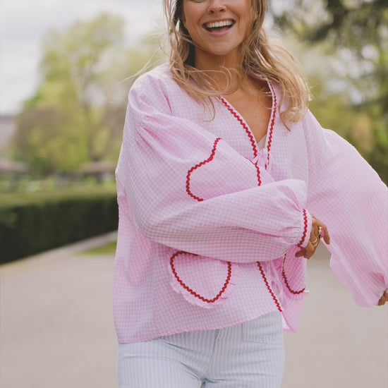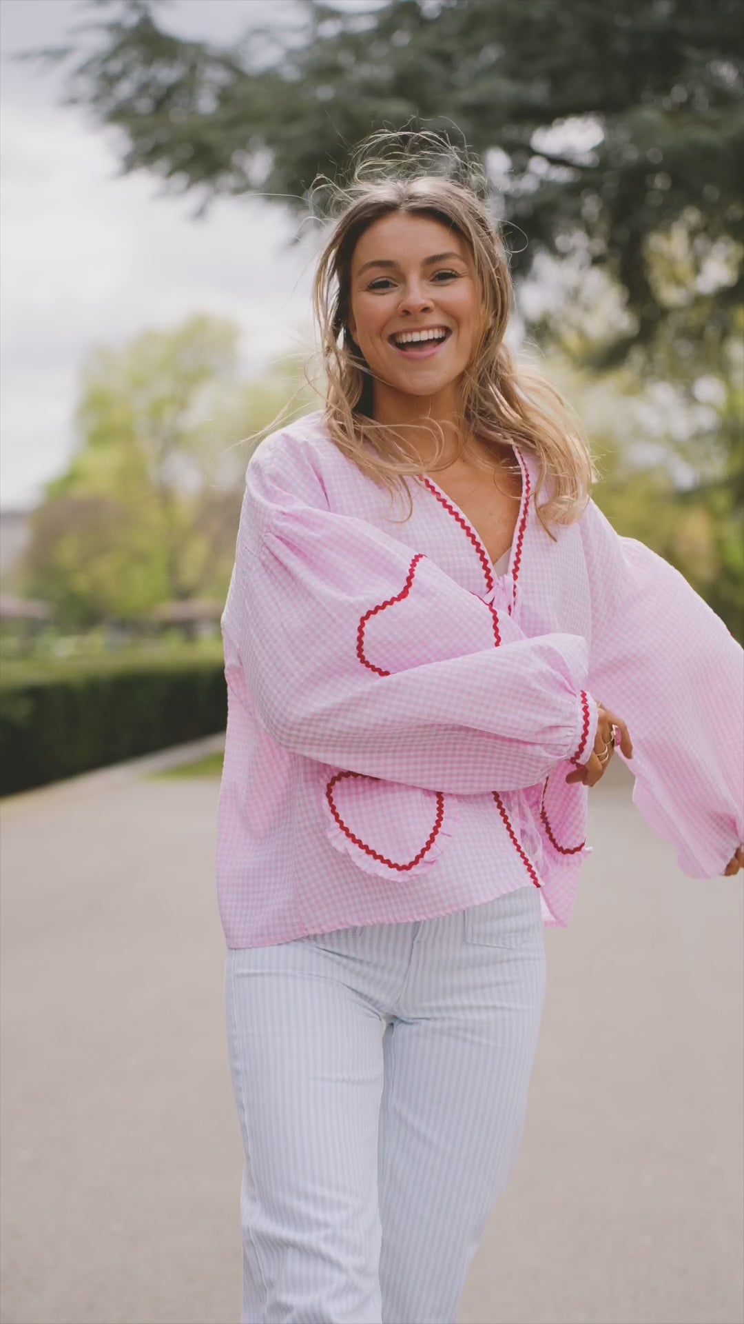 - Pink long sleeve blouse with a fun-trendy gingham pattern all over as well as red embroidered heart detailing. This blouse features bows to tie in the front, a slightly loose and flowy fit and does not offer lining. The perfect girly-chic blouse to add to your wardrobe collection.