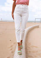 - Stylish white jeans, designed with a high-rise fit that accentuates your waist. These jeans feature belt loops for added versatility, as well as practical pockets on both the front and back. The frayed effect at the bottom adds a trendy touch, making these jeans a perfect addition to your wardrobe for a chic and casual look.