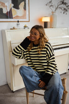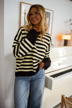 Add a pop of color with the Yellow and Brown Emilie Sweater. Designed with a classic crew neck, long sleeves, and a slightly loose fit, this sweater blends comfort and style effortlessly. The warm yellow and brown stripes give it a playful, modern vibe, making it perfect for casual days or layering with your favorite pieces.