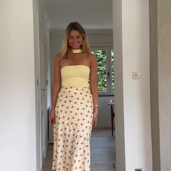 The Yellow Floral Emy Skirt effortlessly brightens your wardrobe with its gentle charm and graceful flow. Made from satin-effect fabric, it features a subtle red floral pattern set against a soft yellow backdrop. Its long silhouette is enhanced by a flattering side pull, while the red embroidered waistband adds a refined touch. Designed to be unlined yet fully opaque, this skirt is a light and airy choice perfect for warm, sunny days.